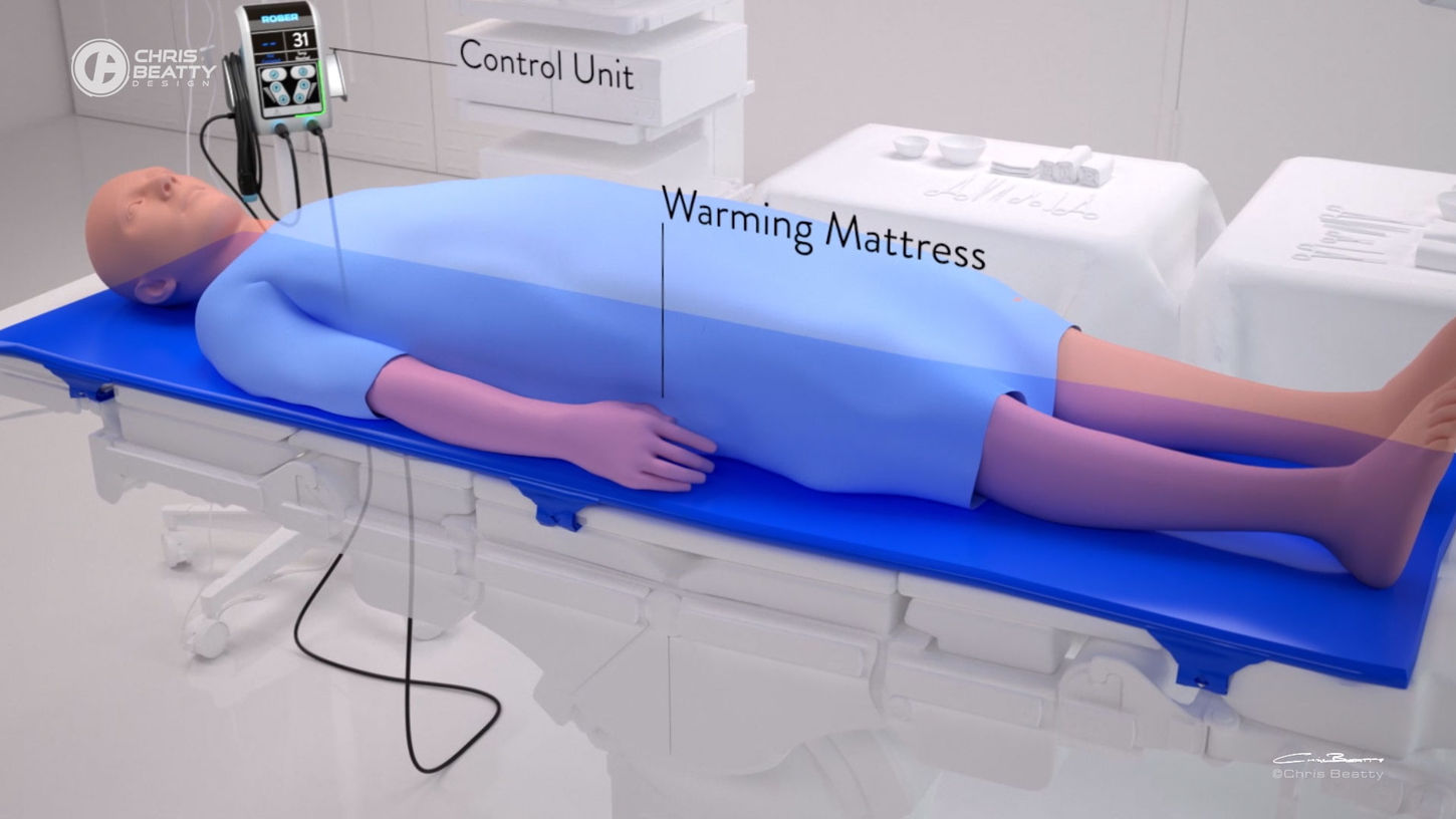 Animation showcasing how Robers' new mattress warming system works in an operating theatre scenario, so stabilise a patient's core temperature during long operations. Undertake on behalf of medical device design company Triteq.